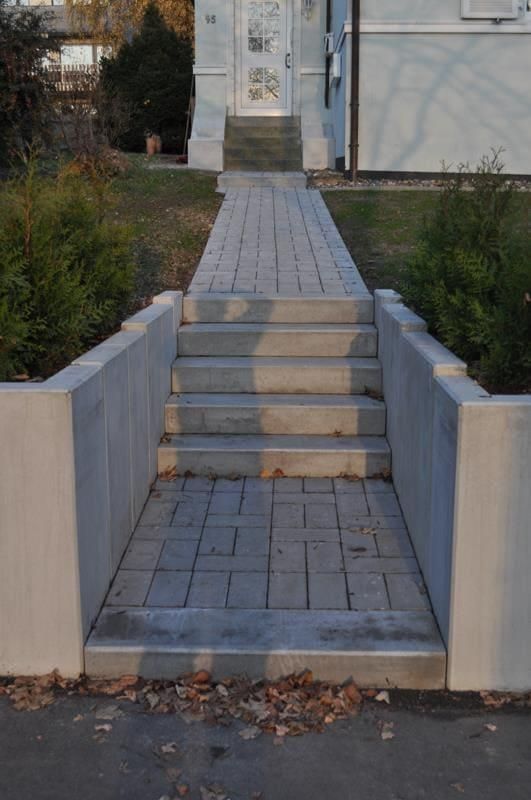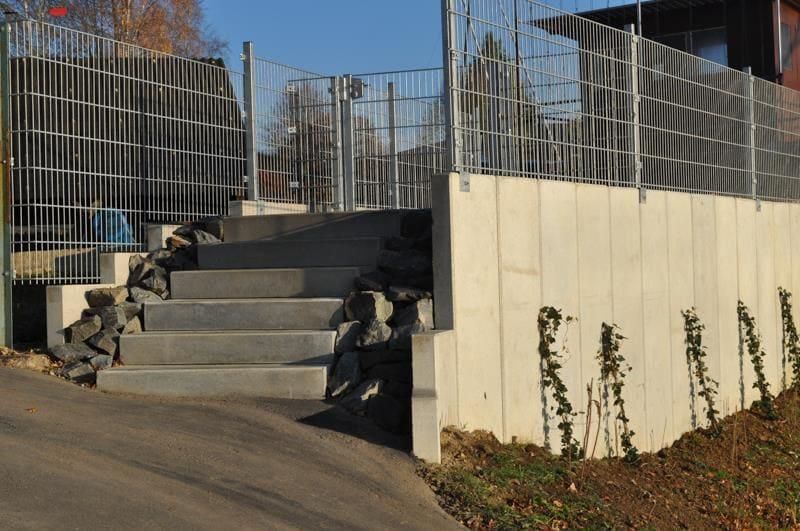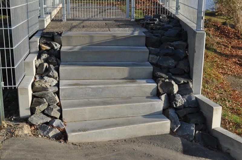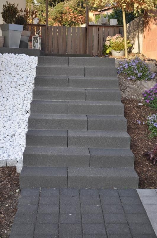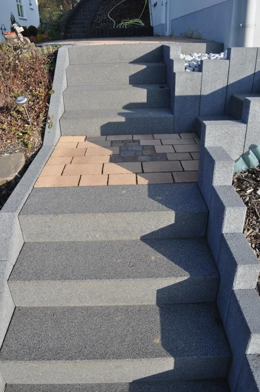 - Beton: Dieser Baustoff ist das gebräuchlichste Material für Außentreppen. Er lässt sich leicht verarbeiten und weist eine hohe Haltbarkeit auf. Beton kann heutzutage sogar in der Farbe und in der Struktur verändert werden, aber auch einfacher, grauer, gegossener Beton kann modern und schick aussehen. Alternativ kann man aus Beton auch nur das Fundament gießen und anschließend Blockstufen aus anderen Materialien wie z.B. Granit, Sandstein, Kalkstein, Schiefer, Basalt, Porphyr oder Quarzit setzen.